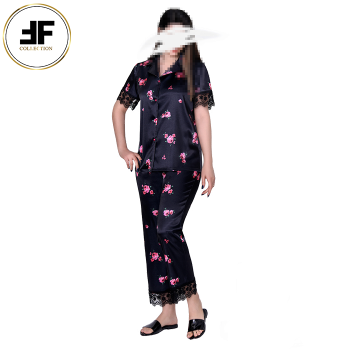 لباس خواب زنانه ست بلوز و شلوارک طرح گلسرخی مشکی
